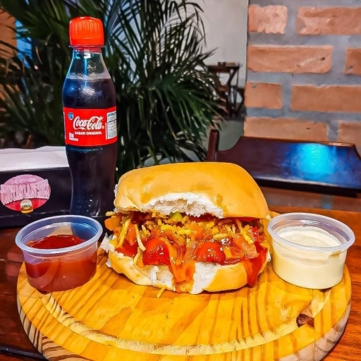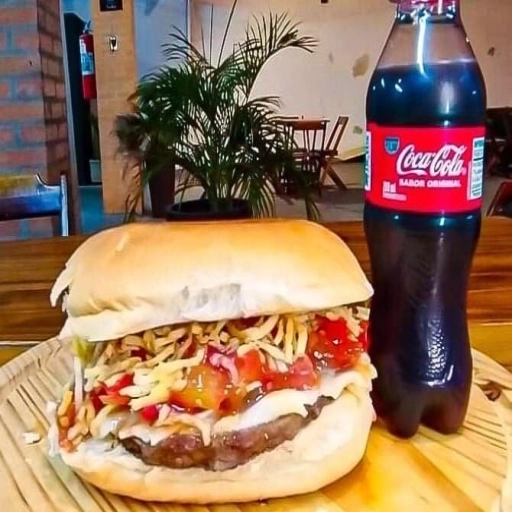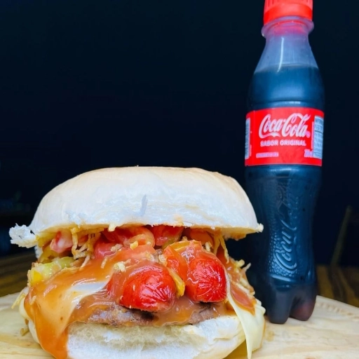 Pão brioche, maionese, ketchup, molho barbecue, hambúrguer artesanal, queijo muçarela, alface, tomate picado, molho b... Ver completo