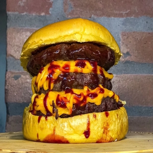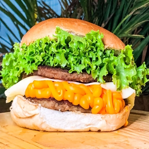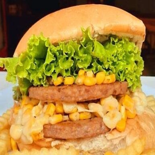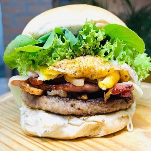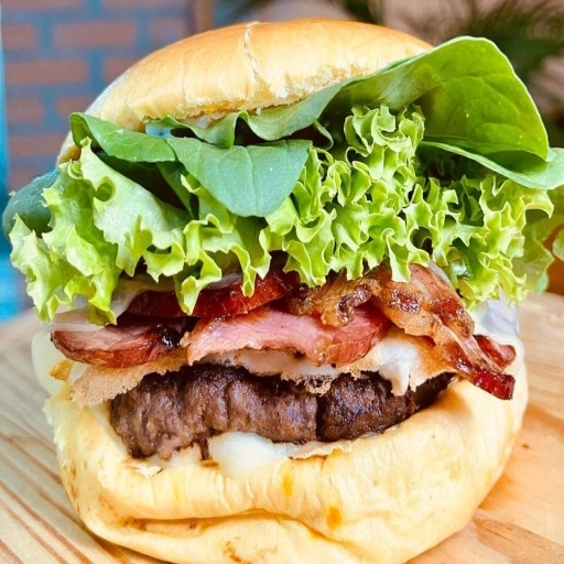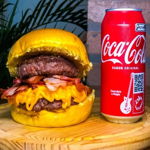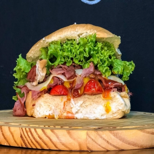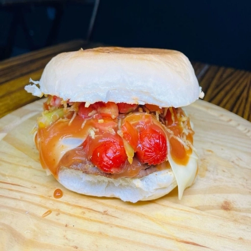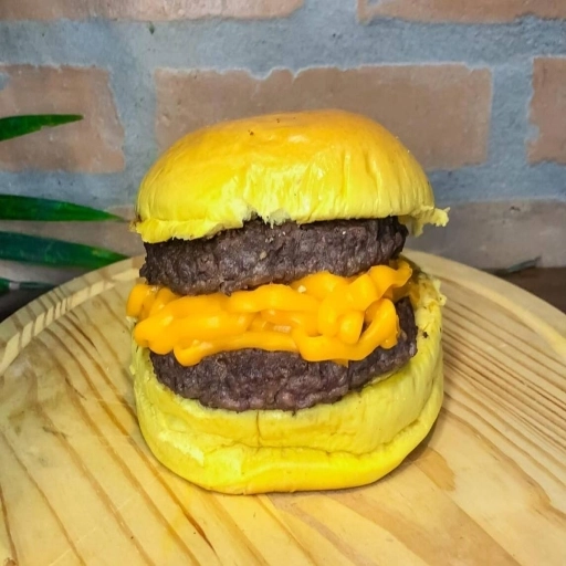 Pão brioche, maionese, ketchup, hambúrguer artesanal, queijo cheddar, queijo muçarela, alface, tomate picado, molho b... Ver completo