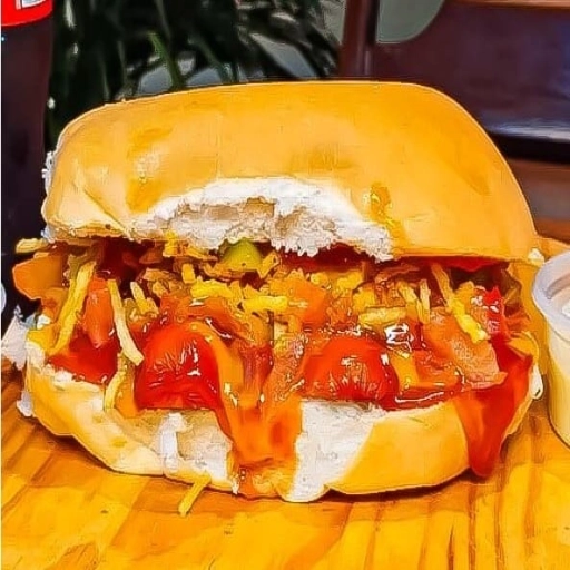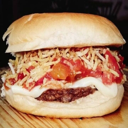 Pão tradicional, maionese, ketchup, hambúrguer tradicional, muçarela, tomate picado, batata palha