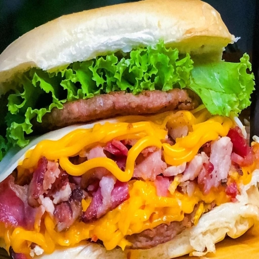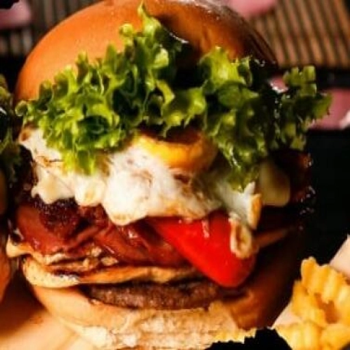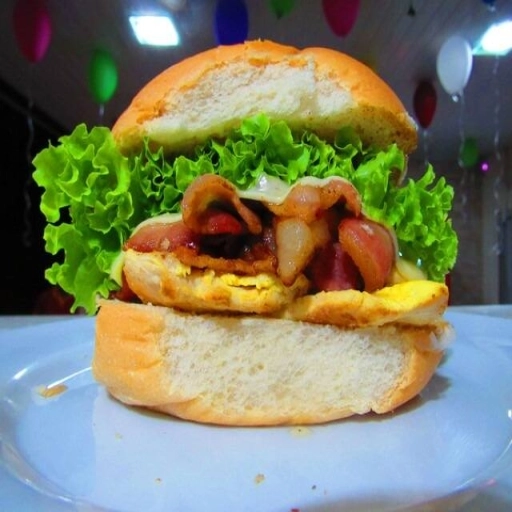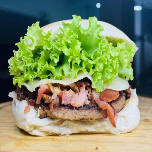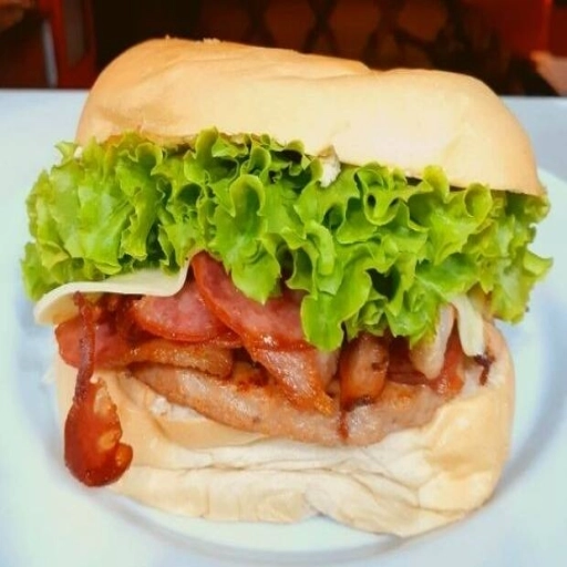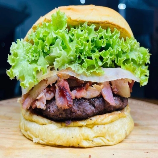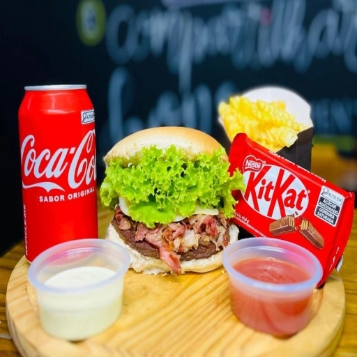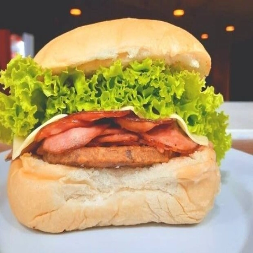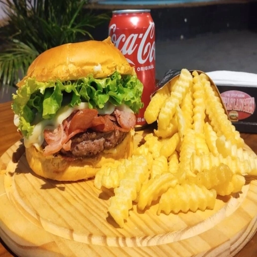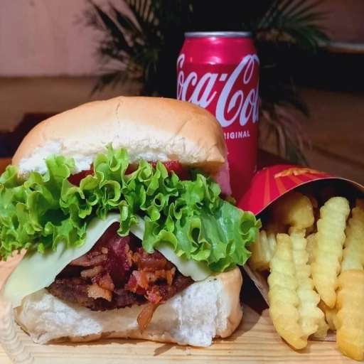 Pão tradicional, maionese, ketchup, hambúrguer tradicional, bacon, queijo muçarela, alface, tomate picado, batata pal... Ver completo