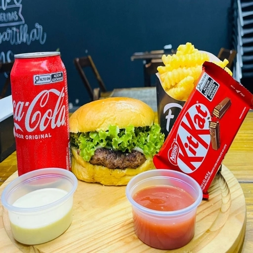 Pão tradicional, hambúrguer tradicional, queijo muçarela + 1 fritas + 1 Suco Kapo ou mini coca + 1 mini Fini
