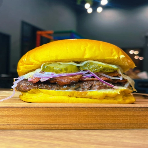 Pão brioche, maionese, ketchup, hambúrguer artesanal, bacon, cebola roxa, queijo muçarela, molho especial.