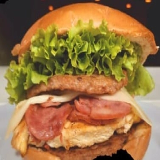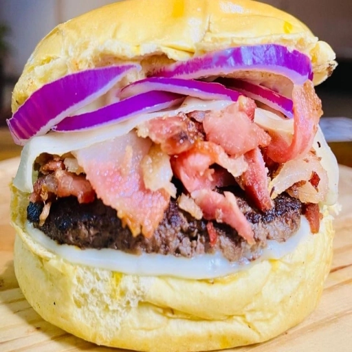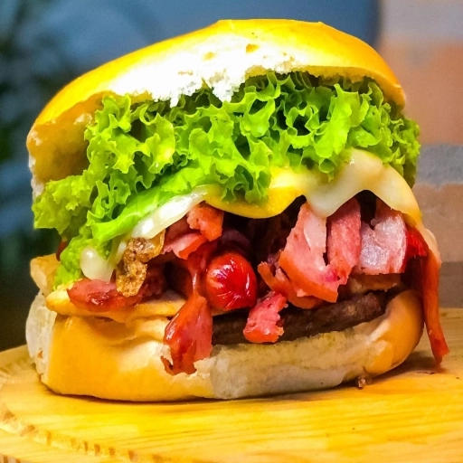 Pão tradicional, maionese, ketchup, hambúrguer tradicional, bacon, queijo muçarela, alface, tomate picado, batata pal... Ver completo