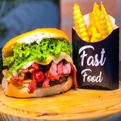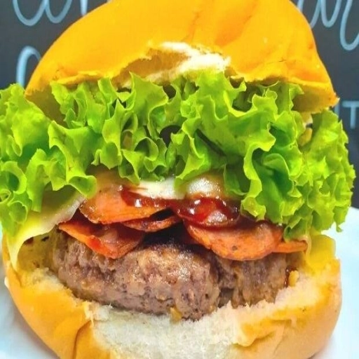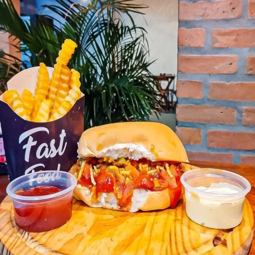 Pão brioche, maionese, ketchup, hambúrguer artesanal, calabresa, queijo muçarela, alface, tomate picado, batata palha... Ver completo